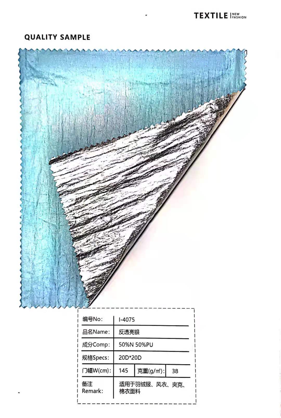 反透亮銀羽絨服風(fēng)衣夾克棉衣50%N 50%PU 38克面料