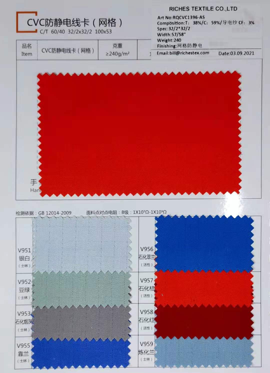 - ?CVC防靜電紗卡面料(網(wǎng)格)38%T*59%C*3%導(dǎo)電紗 240克面料