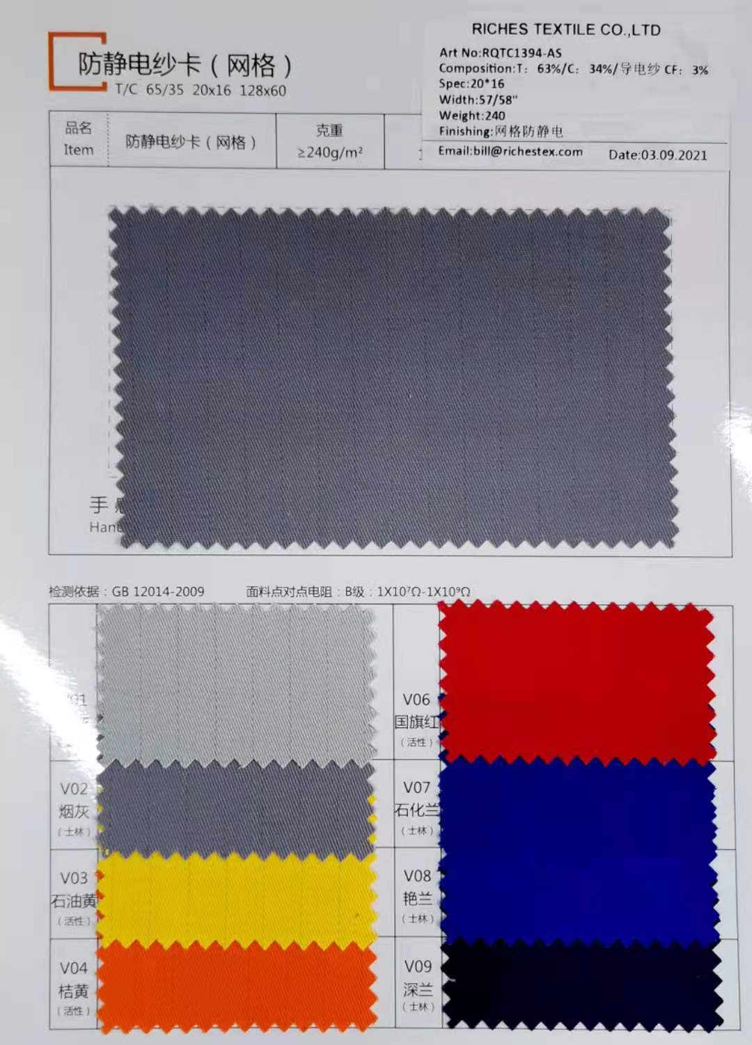 - ?CVC防靜電紗卡面料(網(wǎng)格)38%T*59%C*3%導(dǎo)電紗 240克面料